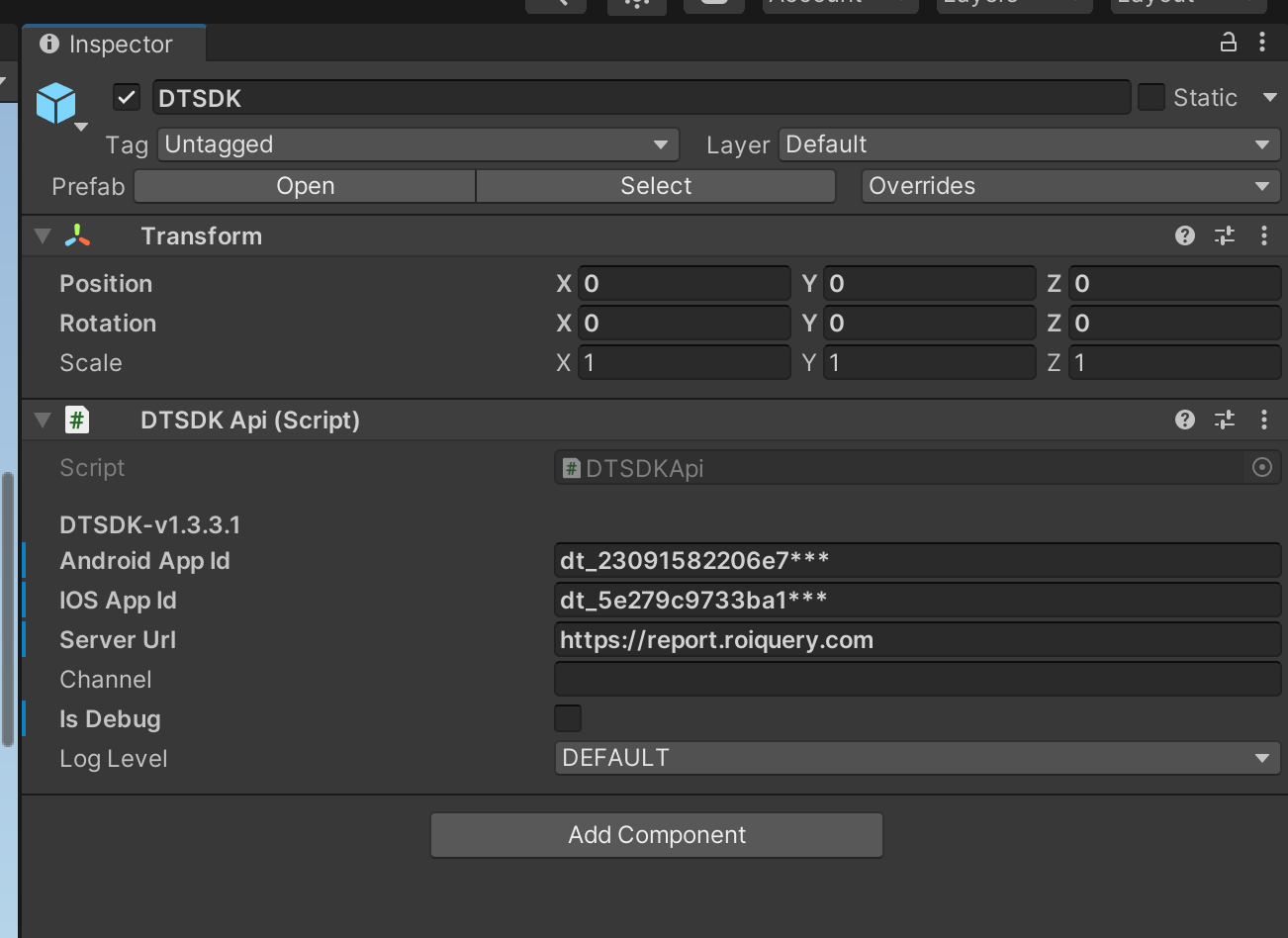 3.将 DataTower/ 目录下的 DTSDK.prefab 预制体拖到需要加载的位置(一般放在第一个场景)